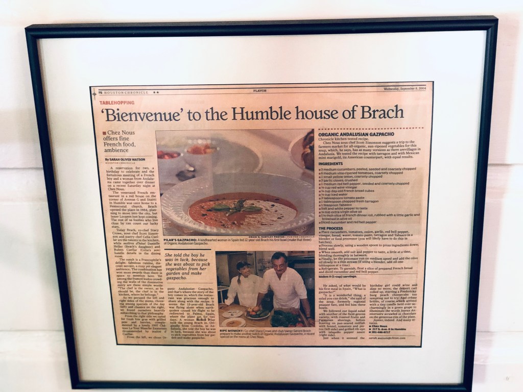 As we waited, I walked around the room reading framed newspaper clippings hanging on the walls. Suddenly, one of the headlines looked vaguely familiar. I headed for a closer look and, seeing my byline, remembered covering the restaurant 20 years ago while working at the Houston Chronicle. I was honored that the management had framed my work and felt that old thrill of seeing my name in print. This particular piece was a Tablehopping column – part-review, part-feature – for which the reporter was tasked with not only persuading the restaurant’s chef to share a recipe but also shopping for the ingredients and preparing the dish at home – there was no test kitchen at the newspaper – before entrusting it to the composing room for publication.